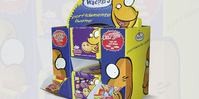 Espositore dispencer realizzato per chewing gum wacko’s. Materiale punto vendita per acquisto d’impulso. In questo caso sono stati progettati due sportelli laterali che rimangono chiusi nella fase di riempimento della struttura (effettuata dall’alto) e vengono poi aperti sul punto vendita.