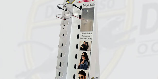 Progettazione volta a riprodurre in cartone una struttura usualmente realizzata in materiale durevole. Sempre in cartone studio e produzione dei ganci, su cui appoggiano gli occhiali, completamente abbattibili.
