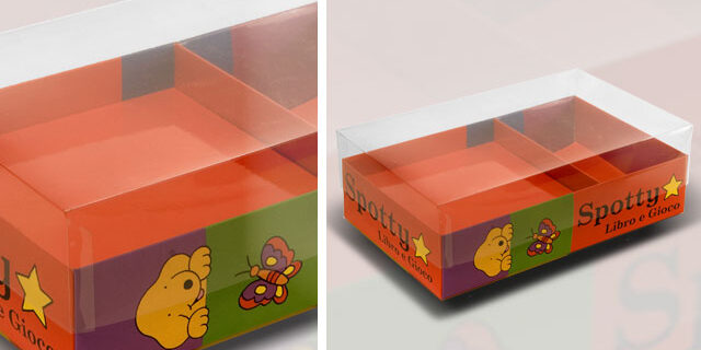 Packaging progettato e realizzato per ospitare prodotto editoriale e pelouche. Il tutto reso molto visibile dal coperchio interamente in Pvc.